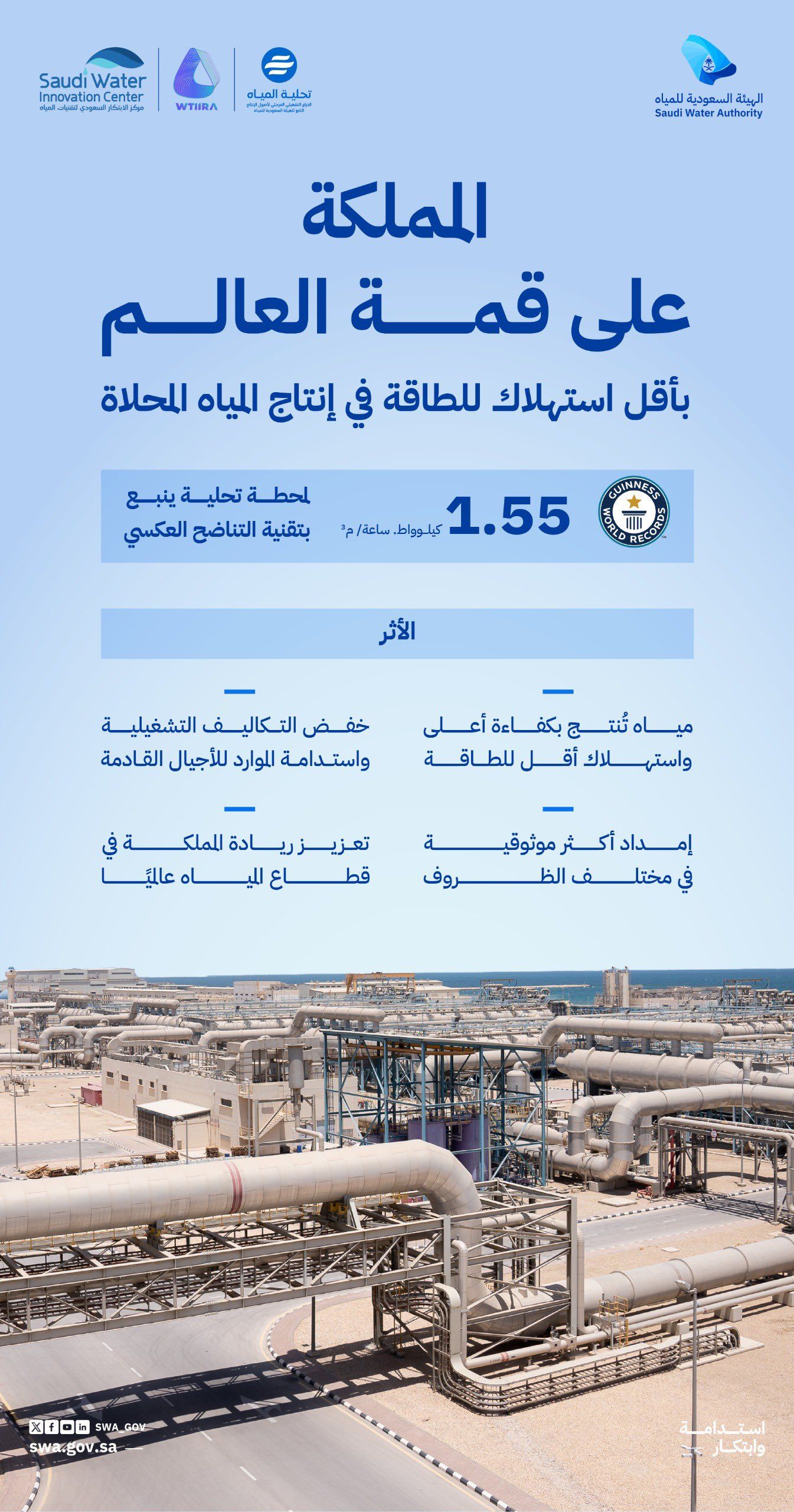 حققت الهيئة السعودية للمياه إنجازاً عالمياً جديداً بدخول موسوعة “غينيس” للأرقام القياسية، وذلك بعد تسجيل محطتها المتنقلة في منظومة إنتاج ينبع أدنى مستوى لاستهلاك الطاقة في إنتاج المياه عالمياً، بواقع 1.55 كيلو واط لكل متر مكعب، مما يرسخ ريادة المملكة في إعادة تعريف كفاءة قطاع المياه عالمياً.