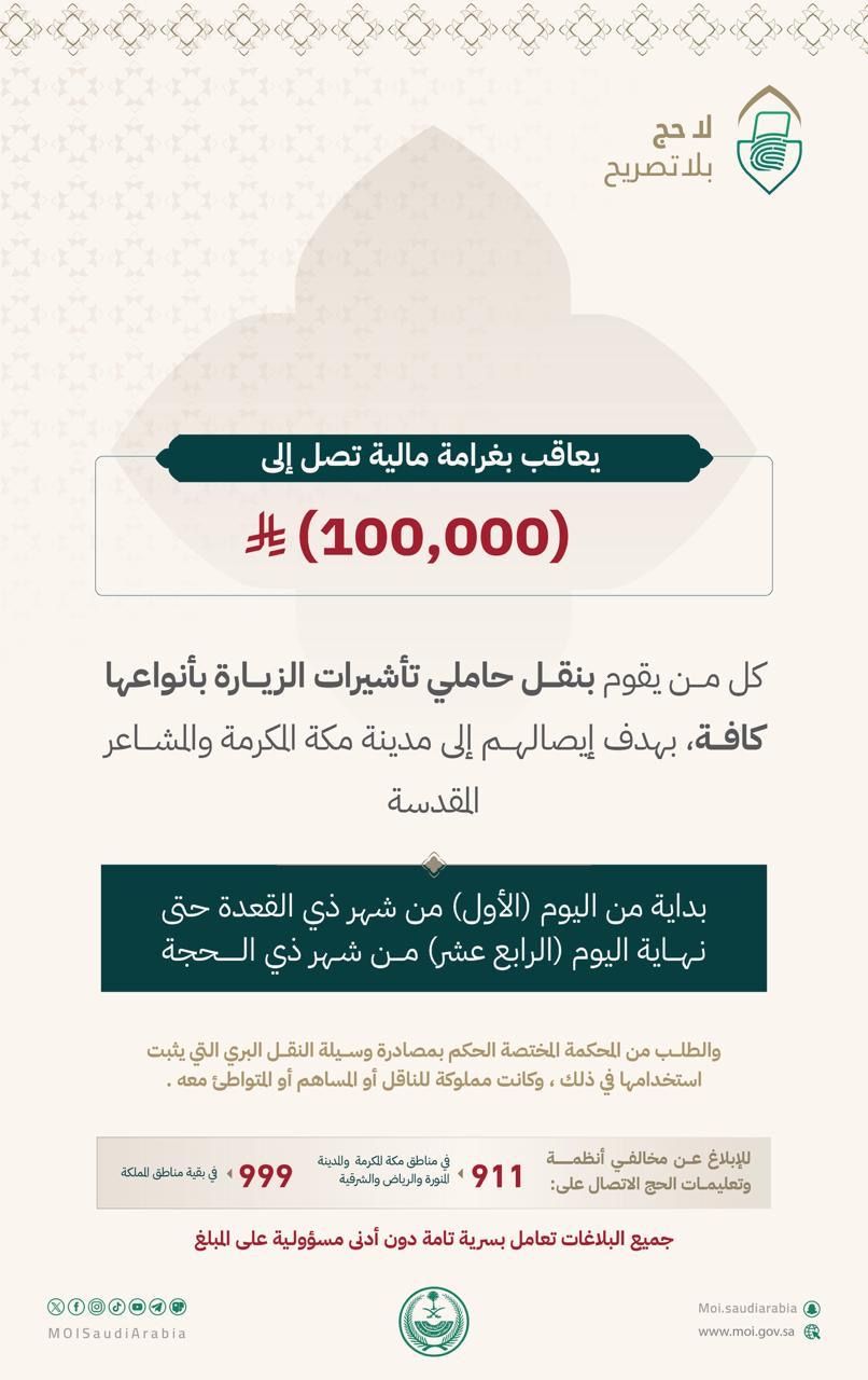 أعلنت وزارة الداخلية أن غرامة مالية تصل إلى (100,000) ريال ستُطبق بحق كل من ينقل حاملي تأشيرات الزيارة بهدف إيصالهم إلى مدينة مكة المكرمة والمشاعر المقدسة، وذلك خلال الفترة من اليوم الأول من شهر ذي القعدة حتى نهاية اليوم الرابع عشر من شهر ذي الحجة.