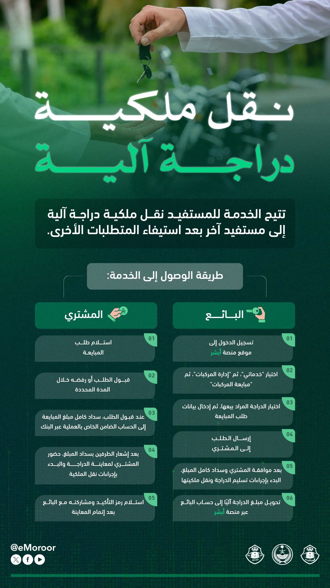 فمن جانب البائع، تبدأ العملية بتسجيل الدخول إلى منصة “أبشر”، ثم التوجه إلى “خدماتي” واختيار “إدارة المركبات” ومن ثم “مبايعة المركبات”، ليتم اختيار الدراجة المراد بيعها وإدخال بيانات طلب المبايعة وإرساله إلى المشتري، على أن يتم استكمال إجراءات التسليم ونقل الملكية بعد موافقة المشتري وسداد قيمة المبايعة، حيث يتم تحويل المبلغ آليًا إلى حساب البائع عبر المنصة.
