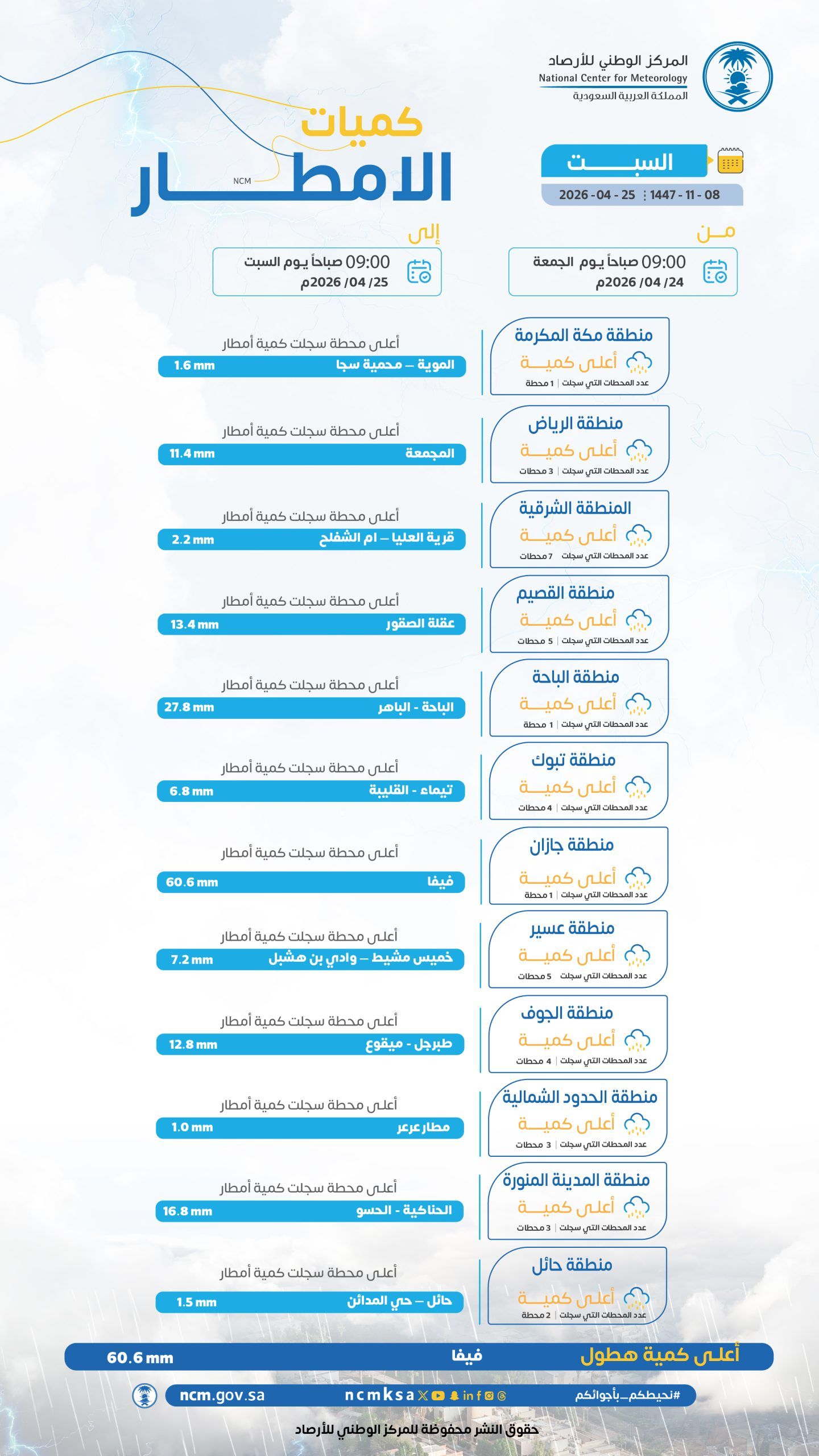 وأوضح المركز أن كمية الأمطار المسجلة في فيفا بلغت 60.6 ملم، كأعلى معدل هطول خلال الفترة من الساعة 09:00 صباح الجمعة 24 أبريل 2026م حتى الساعة 09:00 صباح السبت 25 أبريل 2026م.