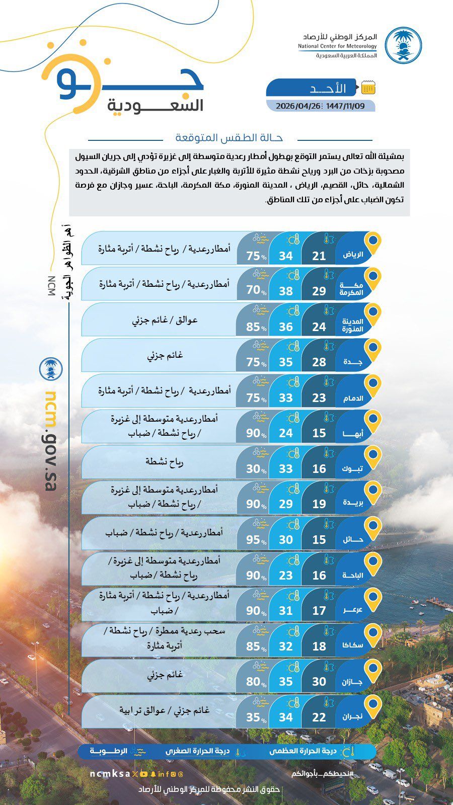 وأوضح التقرير أن الحالة الجوية ستكون مصحوبة بزخات من البرد ورياح نشطة مثيرة للأتربة والغبار، تؤثر على أجزاء من مناطق الشرقية، الحدود الشمالية، حائل، القصيم، الرياض، المدينة المنورة، مكة المكرمة، الباحة، عسير وجازان، مع فرصة لتكوّن الضباب في بعض هذه المناطق.