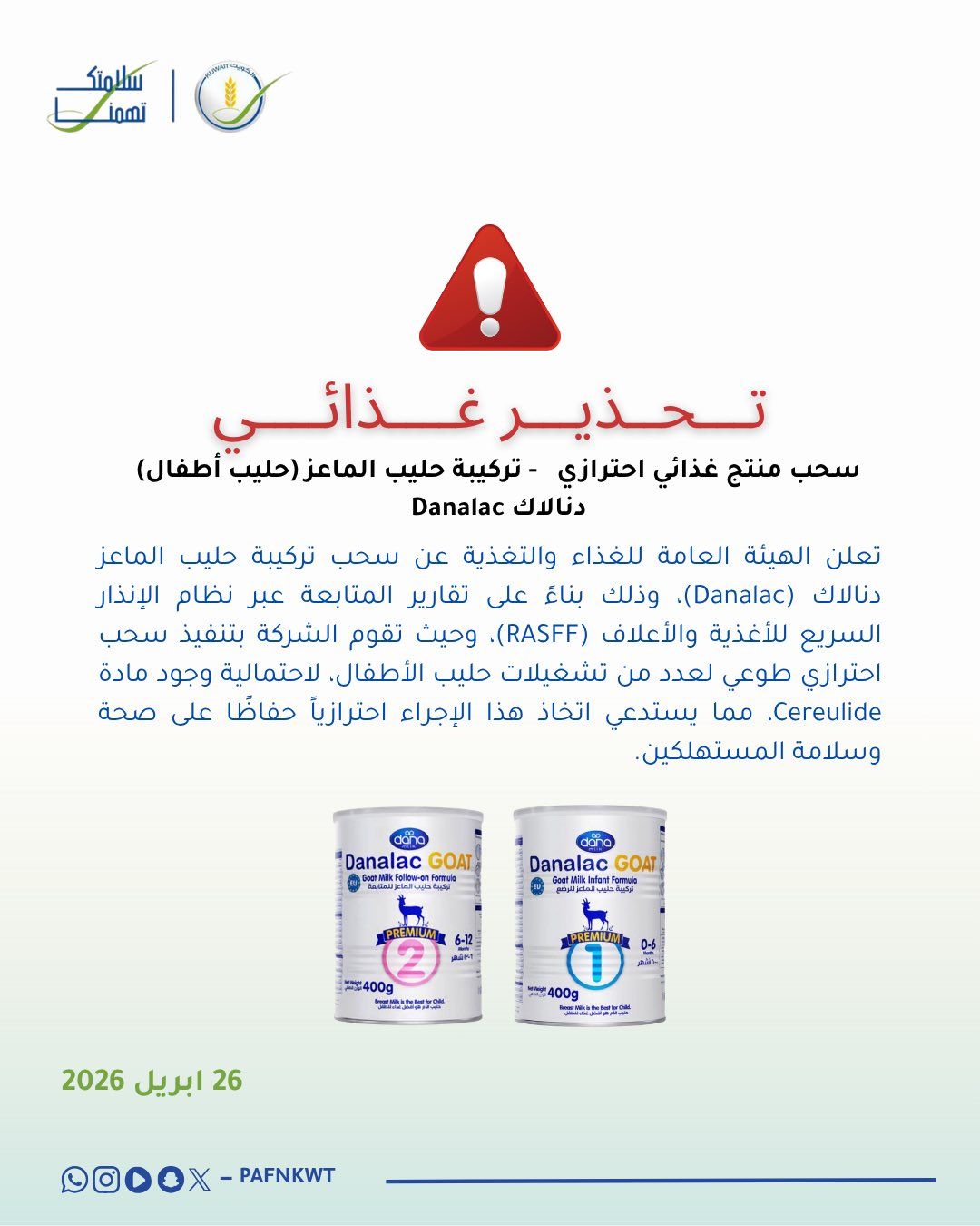 أعلنت الهيئة العامة للغذاء والتغذية في دولة الكويت عن سحب احترازي لمنتج حليب الأطفال «دانالاك» (Danalac) المصنوع من حليب الماعز، وذلك استناداً إلى تقارير نظام الإنذار السريع للأغذية والأعلاف (RASFF)، لاحتمالية احتواء بعض التشغيلات على مادة (Cereulide).