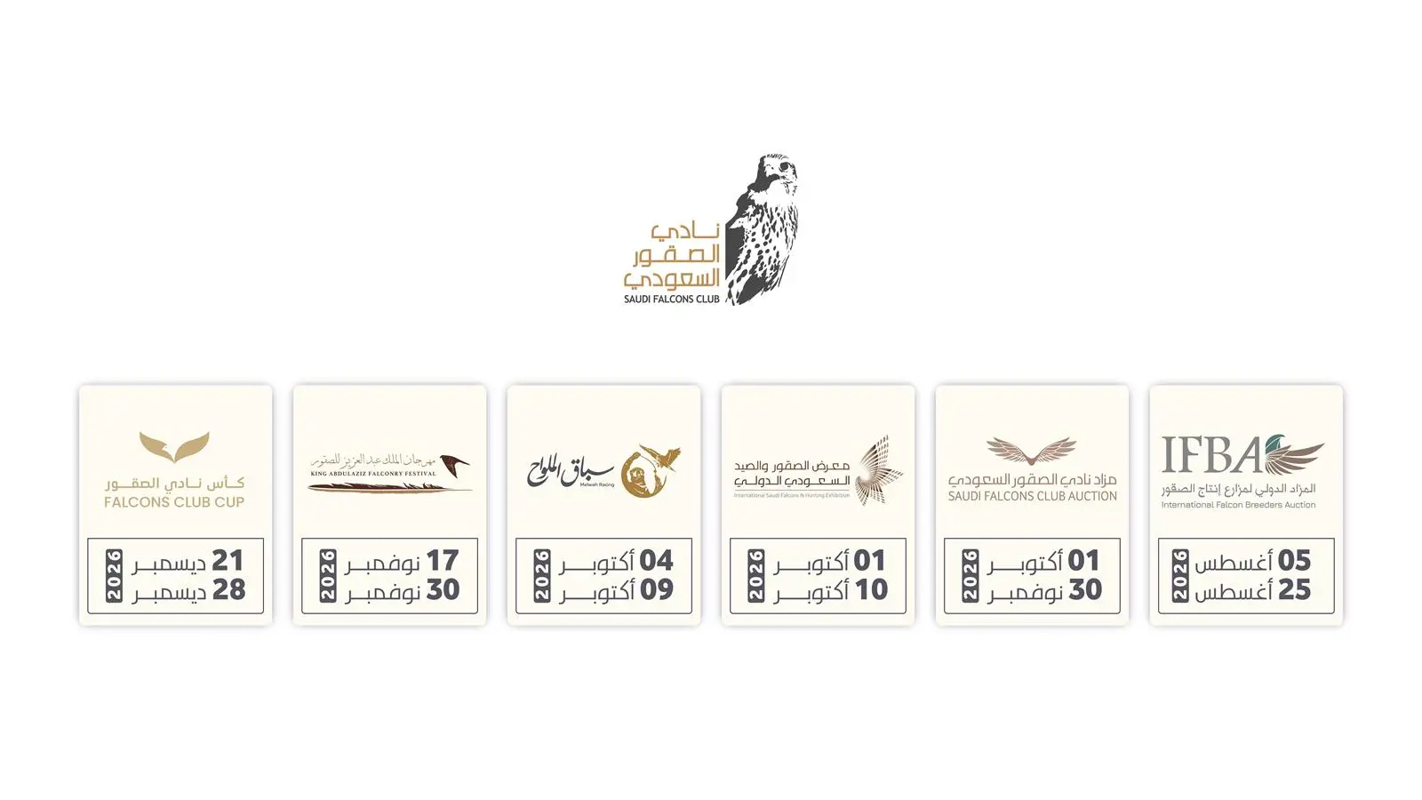 وتتضمن الفعاليات المزاد الدولي لمزارع الإنتاج في أغسطس، ومعرض الصقور والصيد الدولي وسباق الملواح في أكتوبر، ومهرجان الملك عبدالعزيز للصقور في نوفمبر، على أن تُختتم ببطولة كأس نادي الصقور في ديسمبر 2026.