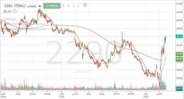 سهم "ينساب" يختبر المقاومة الرئيسية مع تصاعد في أحجام التداول, اليوم الأحد 5 أبريل 2026 11:06 صباحاً