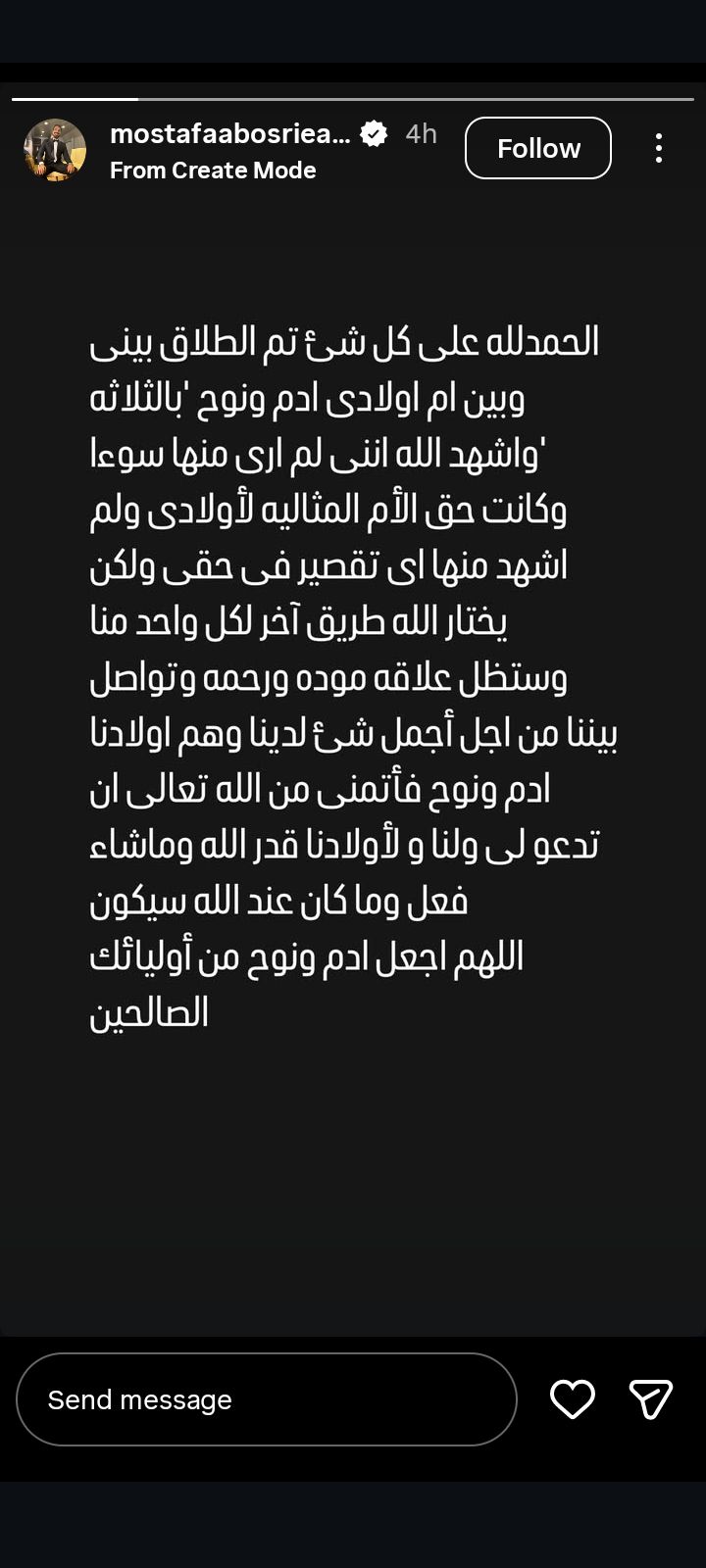 وأعلن مصطفى ابو سريع طلاقه بنفسه، حيث كتب في منشور رصده موقع تحيا مصر: الحمد لله على كل شيء. تم الطلاق بيني وبين أم أولادي، آدم ونوح، وأشهد الله أنني لم أرَ منها إلا كل خير، فقد كانت حقًا الأم المثالية لأبنائنا، ولم أجد منها أي تقصير في حقي، لكن لكل منا طريقًا يختاره الله، وستبقى بيننا علاقة مودة ورحمة وتواصل، من أجل أغلى ما لدينا، وهما أولادنا آدم ونوح.