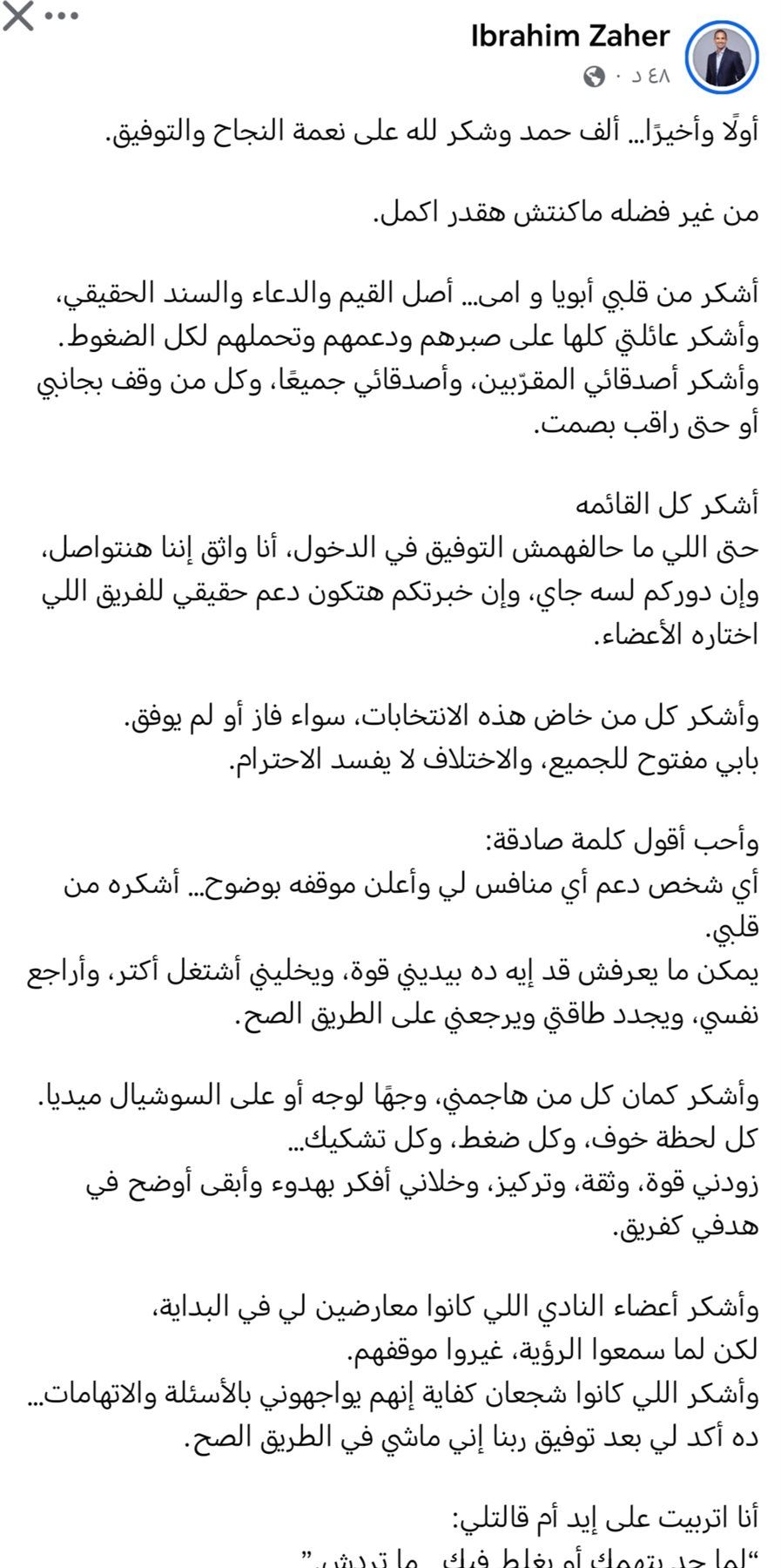 وأشار زاهر إلى تقديره لأعضاء النادي الذين عارضوه في البداية ثم غيروا مواقفهم بعد الاطلاع على رؤيته، مؤكدًا أن مواجهة الأسئلة والاتهامات بشجاعة كانت دليلًا، بعد توفيق الله، على السير في الطريق الصحيح، مشددًا على أنه تربى على عدم الرد على الاتهامات، وأن نيته صافية ولا يحمل في قلبه أي مشاعر سلبية تجاه أحد.