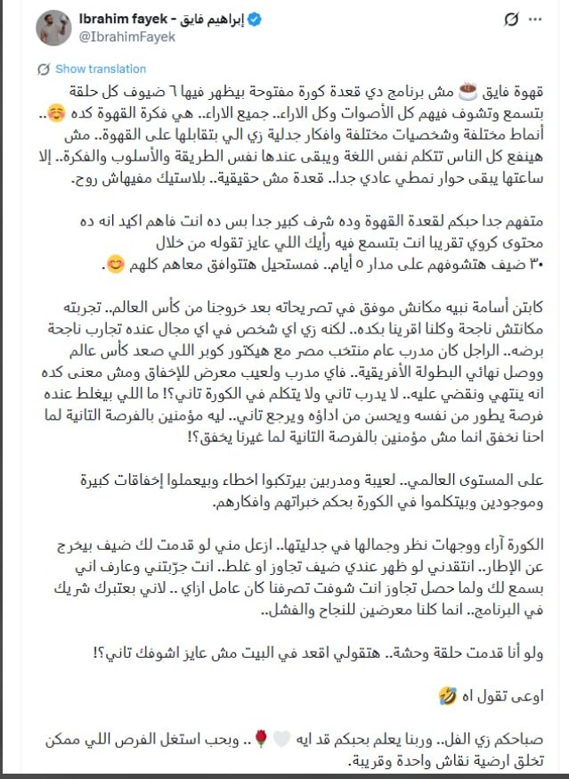 قدم الإعلامي إبراهيم فايق بياناً مطولاً دافع فيه عن فلسفة برنامجه "قهوة فايق"، مؤكداً أنه مساحة حرة لجميع الآراء الكروية المختلفة والمتباينة، تماماً كجلسات القهوة الحقيقية.