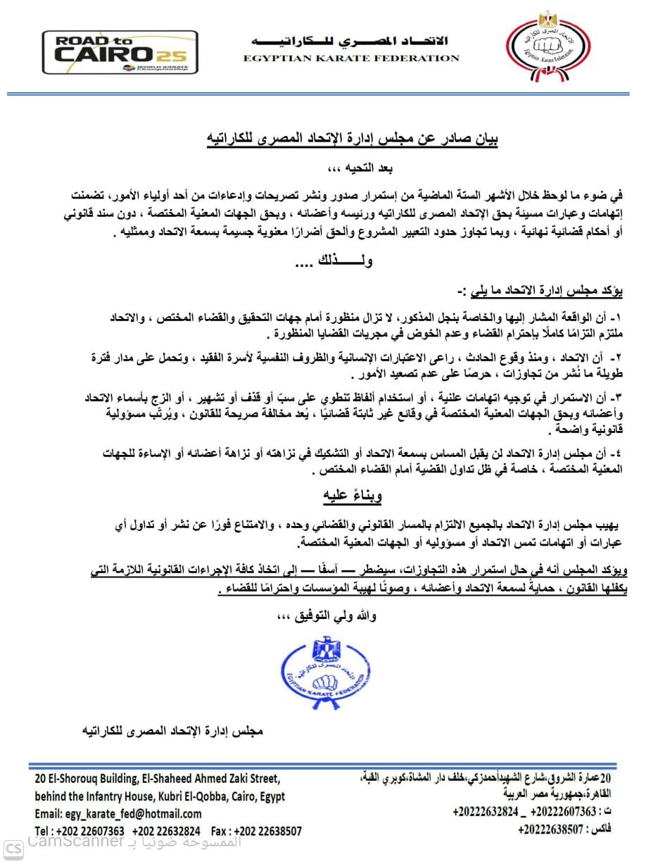 واشار الاتحاد في بيانه الى انه خلال الاشهر الستة الماضية لوحظ استمرار صدور ونشر تصريحات وادعاءات من احد اولياء الامور تضمنت اتهامات وعبارات مسيئة بحق الاتحاد المصري للكاراتيه ورئيسه واعضاء مجلس ادارته، وبحق الجهات المعنية المختصة، دون سند قانوني او صدور احكام قضائية نهائية، وبما تجاوز حدود التعبير المشروع والحقق اضرارا معنوية جسيمة بسمعة الاتحاد وممثليه.