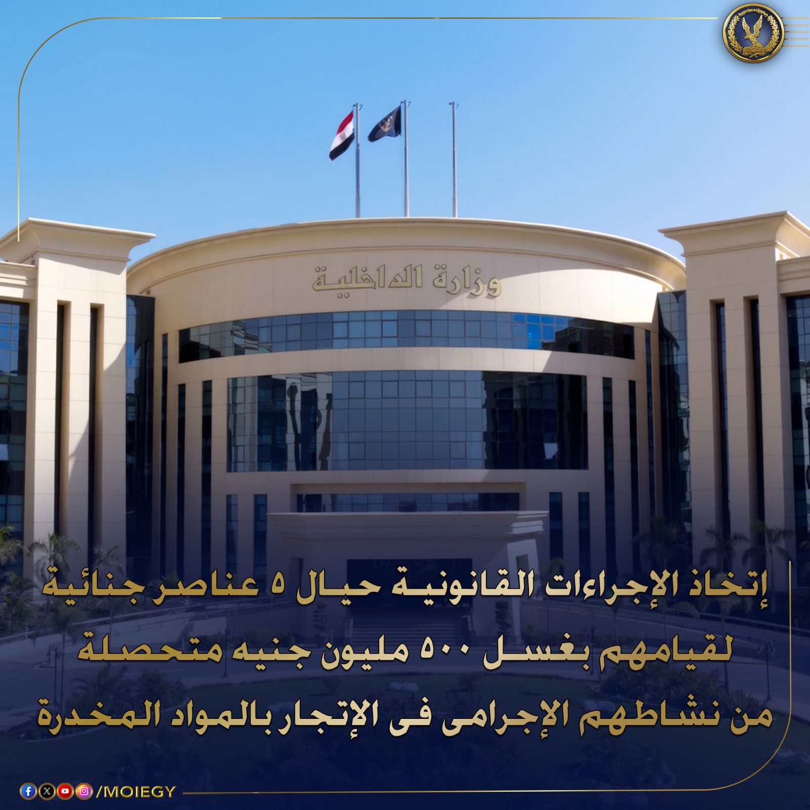 استمرارا لجهود وزارة الداخلية في مكافحة جرائم غسل الأموال وتتبع ثروات ذوي الأنشطة الإجرامية، اضطلع قطاع مكافحة المخدرات والأسلحة والذخائر غير المرخصة، بالتنسيق مع الأجهزة المعنية بالوزارة، باتخاذ الإجراءات القانونية حيال خمسة عناصر جنائية ثبت تورطهم في غسل الأموال المتحصلة من نشاطهم الإجرامي في الاتجار بالمواد المخدرة وترويجها.