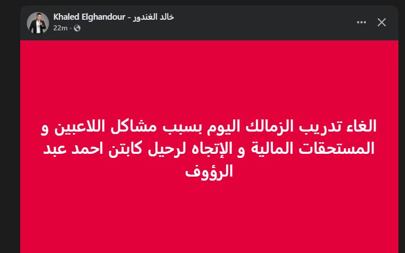 تحيا مصر، وكتب خالد الغندور عبر حسابه الرسمي"فيس بوك":" الغاء تدريب الزمالك اليوم بسبب مشاكل اللاعبين، والمستحقات المالية و الإتجاه لرحيل كابتن احمد عبد الرؤوف".