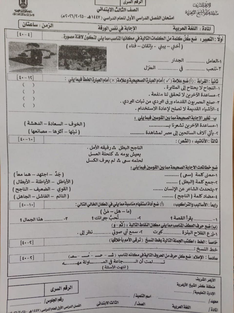 يُذكر أن امتحانات الصف الثالث الابتدائي تُعقد وفق نظام التقييم المعتمد، مع مراعاة تبسيط الأسئلة وتحقيق مبدأ تكافؤ الفرص بين جميع التلاميذ.