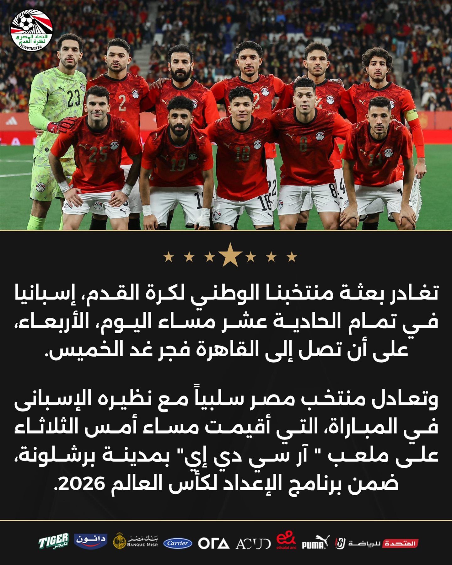 بعثة منتخب مصر تغادر إسبانيا مساء اليوم وتصل القاهرة فجر الخميس