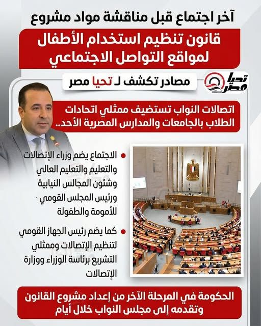 كشفت مصادر خاصة لموقع تحيا مصر، أن لجنة الإتصالات وتكنولجيا المعلومات، برئاسة النائب أحمد بدوي، سوف تعقد اجتماعًا، هامًا يوم الأحد المقبل، استكمالًا لجلسات الاستماع التي أطلقتها اللجنة حول إعداد مشروع قانون تنظيم استخدام مواقع التواصل الاجتماعي للأطفال.