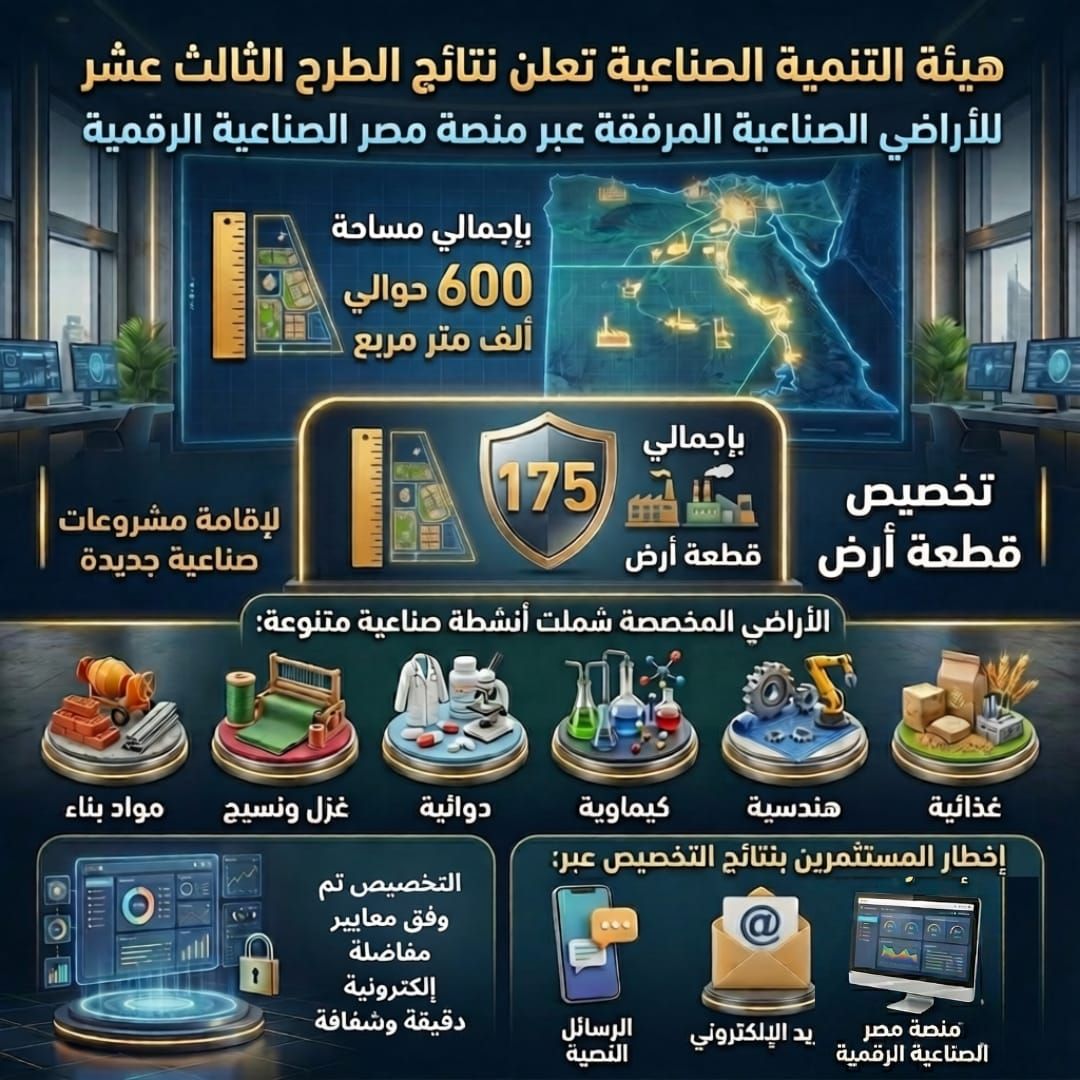 هذا ويمكن للمتقدمين التعرف على نتائج الطرح وموقف طلباتهم من خلال الدخول على منصة مصر الصناعية الرقمية (www.madein.eg)، كما سيتم إخطارهم بنتيجة التخصيص والقطع المخصصة لهم من خلال الرسائل النصية القصيرة والبريد الإلكتروني.