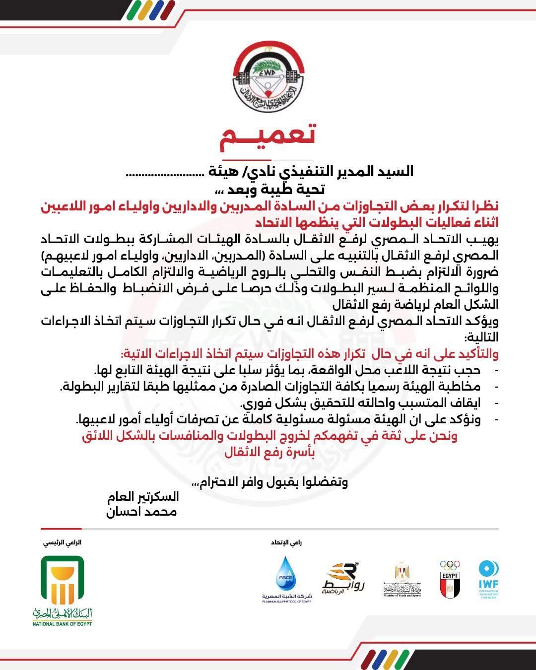 وشدد الاتحاد المصري لرفع الأثقال على أنه في حال تكرار التجاوزات الرياضية سيتم اتخاذ إجراءات حاسمة، تشمل،