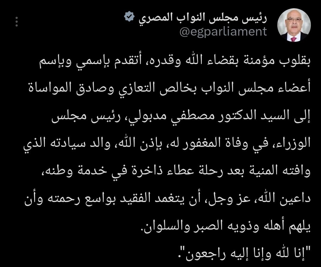 وقال المستشار هشام بدوي، في تغريدة على منصة إكس: "بقلوب مؤمنة بقضاء الله وقدره؛ تقدم المستشار هشام بدوي، رئيس مجلس النواب، بإسمه وبإسم أعضاء مجلس النواب بخالص التعازي وصادق المواساة إلى السيد الدكتور مصطفي مدبولي، رئيس مجلس الوزراء، في وفاة المغفور له، بإذن الله، والد سيادته الذي وافته المنية بعد رحلة عطاء ذاخرة في خدمة وطنه، داعين الله، عز وجل، أن يتغمد الفقيد بواسع رحمته وأن يلهم أهله وذويه الصبر والسلوان".