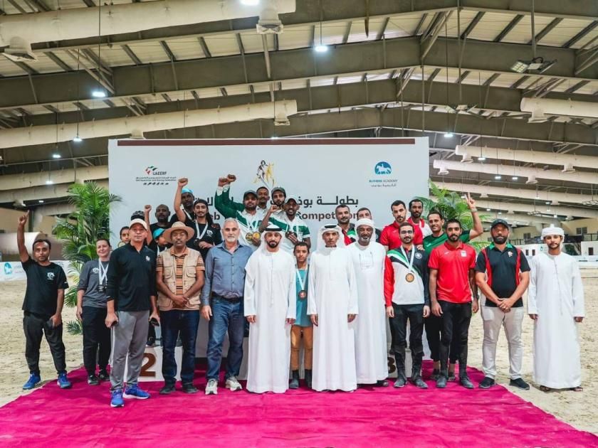 وتوج الفائزين، راشد المزروعي رئيس قسم التقاط الأوتاد بالاتحاد، ومحمد حاتم الجنيبي، مدير الفعاليات بأكاديمية بوذيب للفروسية.