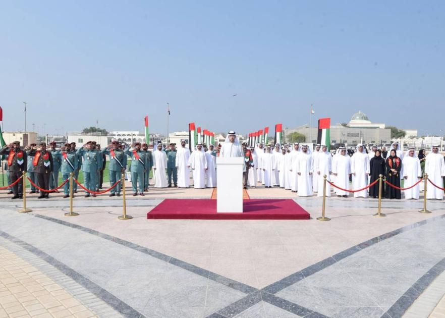 رفع سمو الشيخ أحمد بن سعود بن راشد المعلا، نائب حاكم أم القيوين، علم الدولة في حديقة الخور بأم القيوين احتفاء بمناسبة «يوم العلم».