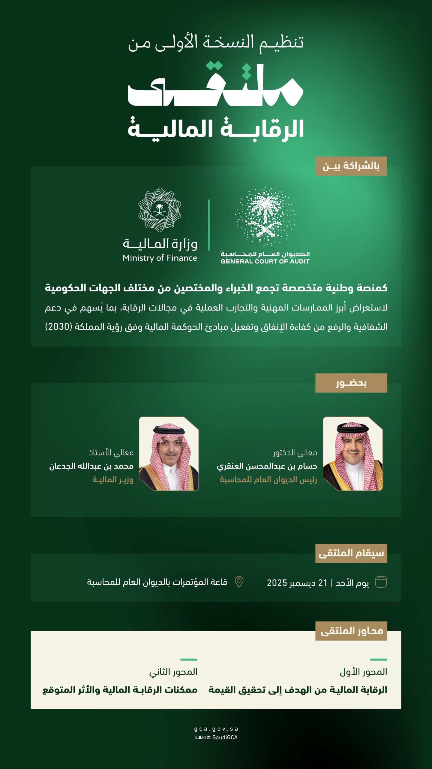 ويأتي تنظيم هذا الملتقى في إطار التعاون القائم والأدوار التكاملية بين الديوان العام للمحاسبة ووزارة المالية في مجال الرقابة المالية على إيرادات الدولة ومصروفاتها وكافة أموالها المنقولة والثابتة، وتعزيز التزام الجهات الحكومية بالأنظمة واللوائح والقرارات والتعليمات ذات الصلة؛ ليشكّل الملتقى منصة وطنية متخصصة تجمع المشاركين من الخبراء والمختصين من مختلف الجهات الحكومية؛ بهدف تعزيز الشراكة وتبادل المعرفة واستعراض أبرز الممارسات المهنية والتجارب العملية في مجالات الرقابة، بما يُسهم في دعم الشفافية والرفع من كفاءة الإنفاق، وتفعيل مبادئ الحوكمة المالية وفق رؤية المملكة (2030).