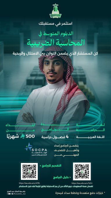 وأوضحت الجامعة أن دبلوم المحاسبة الضريبية يمتد لـ 4 فصول دراسية باللغة العربية، ويهدف لإعداد وتأهيل المستفيدين للتصنيف المهني من الهيئة السعودية للمراجعين والمحاسبين (SOCPA)، برسوم شهرية تبلغ 500 ريال، مع توفر خيارات دفع ميسرة.