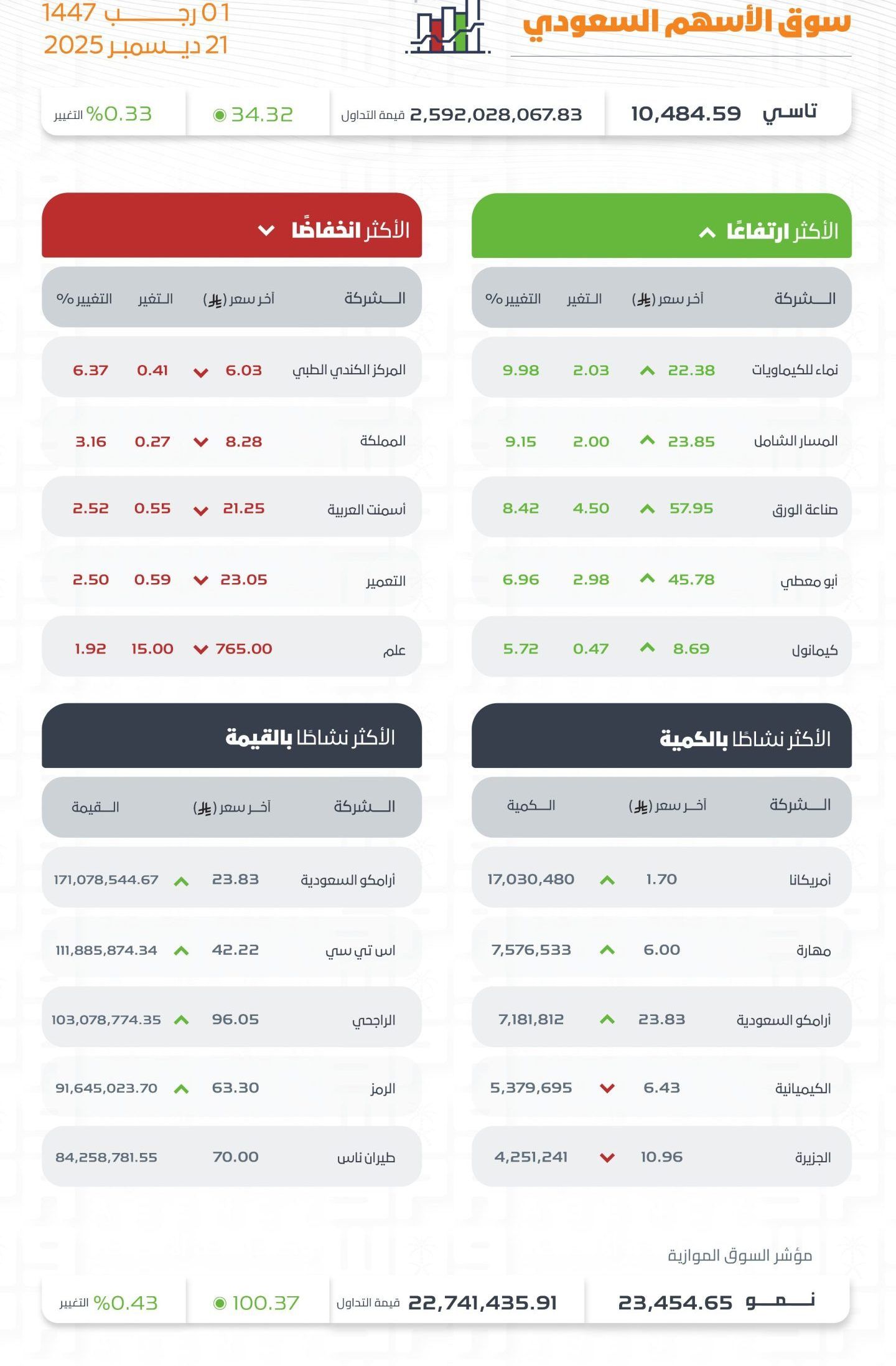 أغلق مؤشر الأسهم السعودية الرئيس اليوم مرتفعًا بمقدار (34.32) نقطة، ليصل إلى مستوى (10484.59) نقطة، وبتداولات بلغت قيمتها (2.5) مليار ريال.