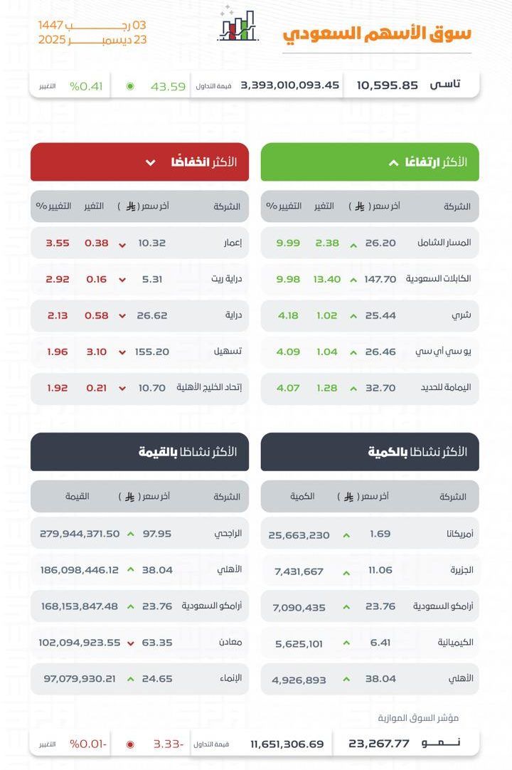 أغلق مؤشر الأسهم السعودية الرئيس اليوم مرتفعًا بمقدار (43.59) نقطة، ليصل إلى مستوى (10595.85) نقطة، وبتداولات بلغت قيمتها (3.3) مليارات ريال.