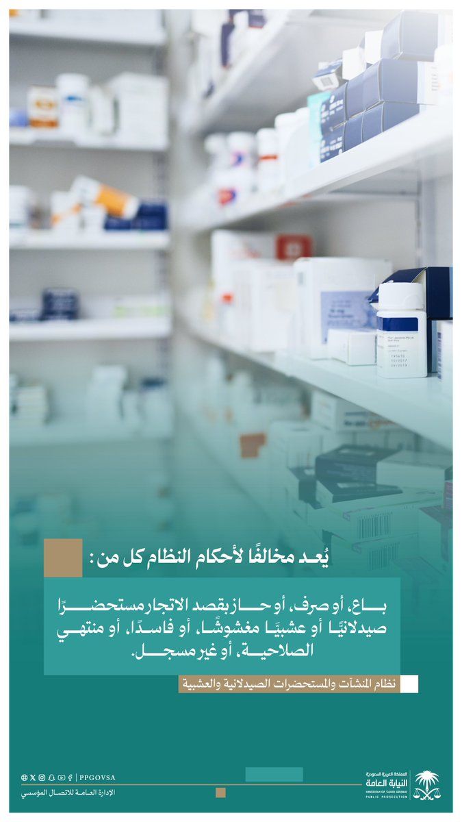 وأوضحت النيابة العامة أنه يُعد مخالفاً لأحكام النظام كل من باع، أو صرف، أو حاز بقصد الاتجار مستحضراً صيدلانياً أو عشبياً مغشوشاً، أو فاسداً، أو منتهي الصلاحية، أو غير مسجل.