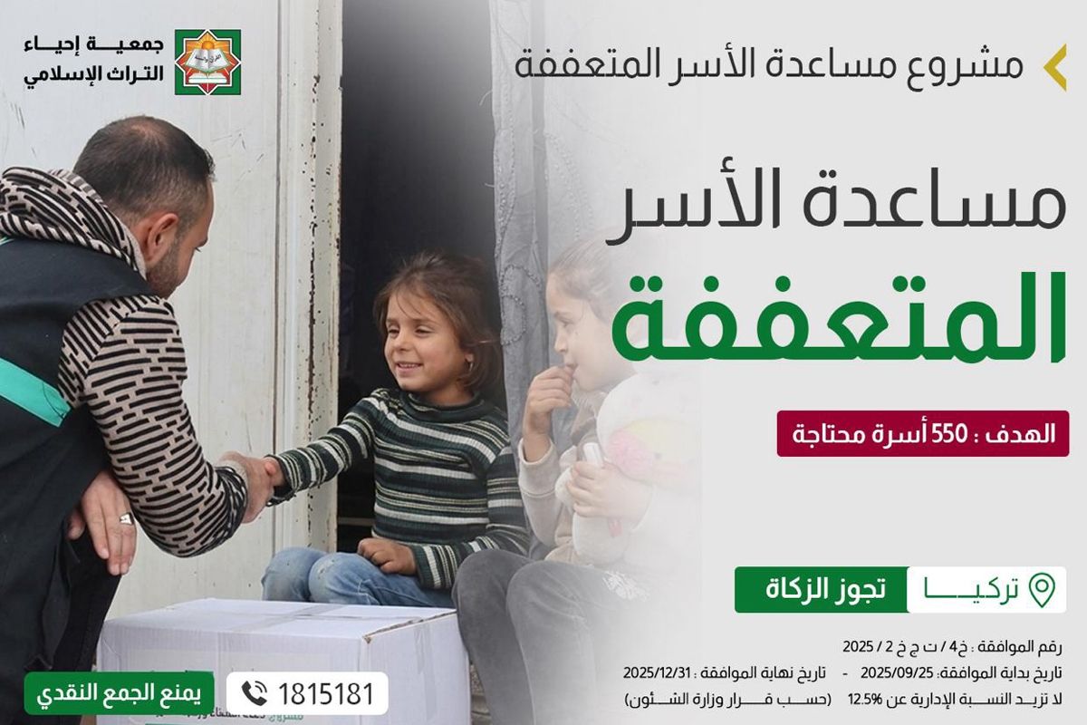 تُطلق جمعية إحياء التراث الإسلامي، اليوم، ضمن مشروعها لمساعدة الأسر المتعففة داخل الكويت وخارجها، مبادرة تقدم فيها المساعدة لـ 550 أسرة محتاجة في تركيا، خصوصاً مع دخول فصل الشتاء وانخفاض درجات الحرارة.