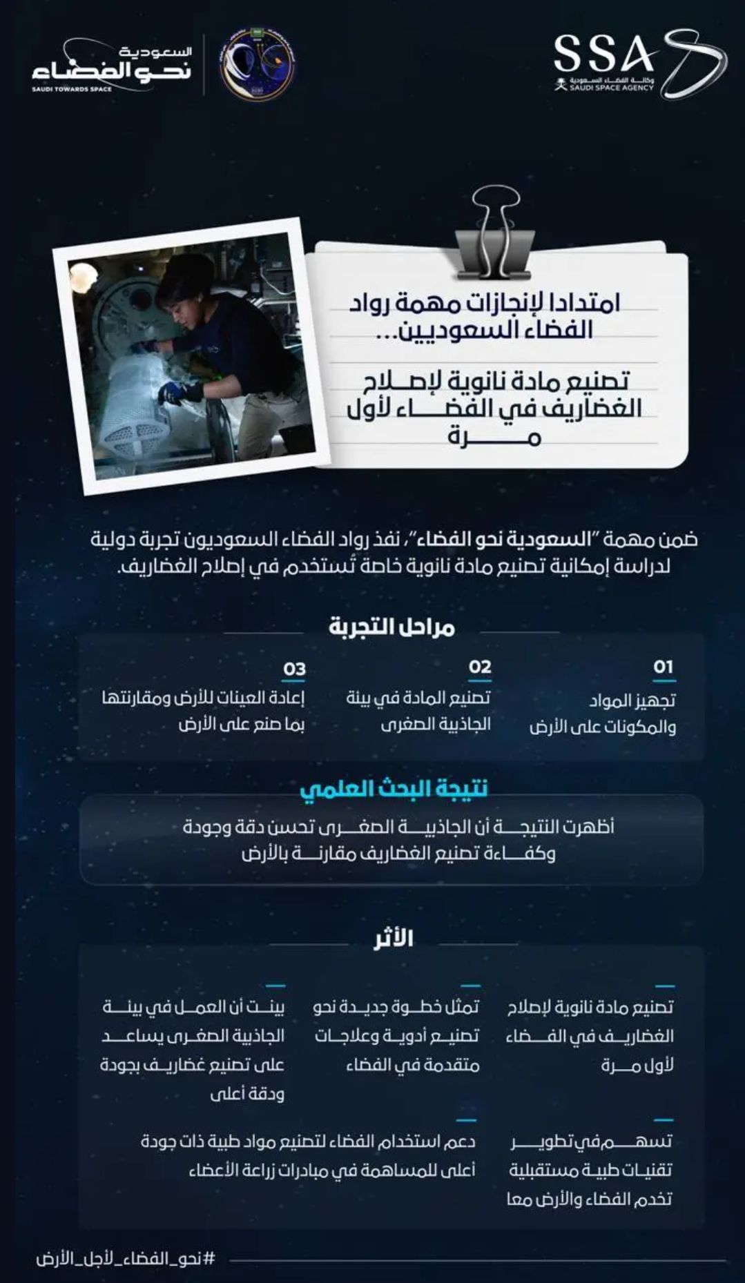 وأوضحت أن البحث العلمي الذي قاده كل من العالم يوبينغ تشين وماري آن سنو ضمن تعاون علمي دولي ركز على تطوير مواد حيوية متقدمة لهندسة الأنسجة، فيما تولت رائدة الفضاء السعودية ريانة برناوي تنفيذ التجربة في الفضاء وجمع البيانات في بيئة الجاذبية الصغرى، مما أسهم في تحقيق إنجاز علمي يتمثل في تصنيع مادة نانوية مخصصة لإصلاح الغضاريف في الفضاء لأول مرة، في خطوة تدعم التوجه نحو تصنيع أنسجة وعلاجات متقدمة تسهم في مبادرات زراعة الأعضاء.