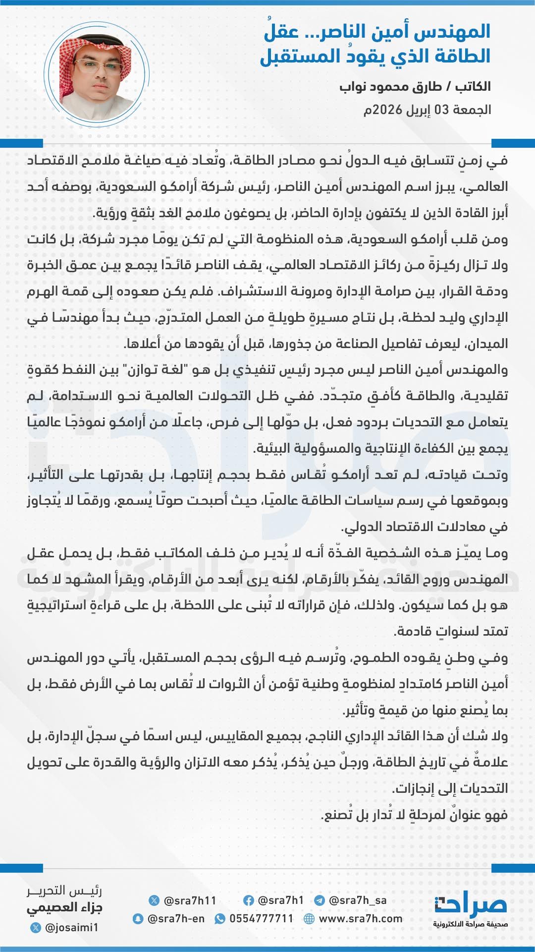 في زمنٍ تتسابق فيه الدولُ نحو مصادر الطاقة، وتُعاد فيه صياغة ملامح الاقتصاد العالمي، يبرز اسم المهندس أمين الناصر، رئيس شركة أرامكو السعودية، بوصفه أحد أبرز القادة الذين لا يكتفون بإدارة الحاضر، بل يصوغون ملامح الغد بثقةٍ ورؤية.