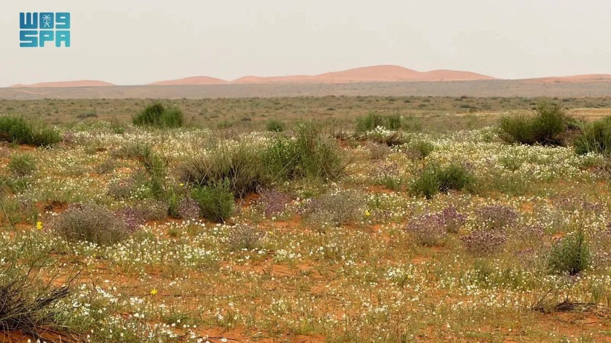 كما انتشرت الأزهار البرية بألوانها المتنوعة، متداخلة مع الأعشاب والشجيرات الصحراوية على مد النظر، لتضفي على المنطقة الرملية لوحة طبيعية نابضة بالحياة، وسط أجواء ربيعية معتدلة.