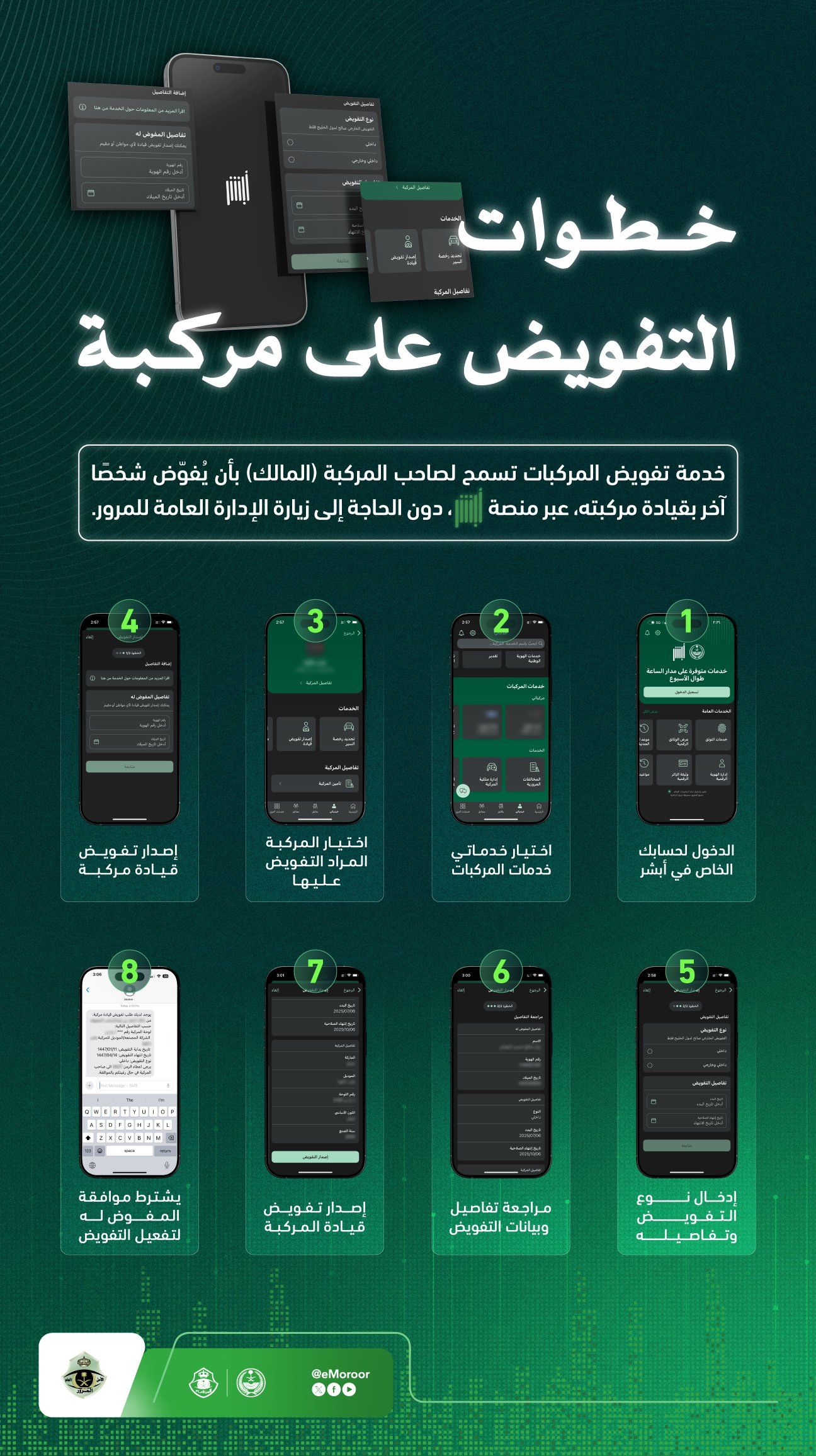 وتتضمن الإجراءات اختيار المركبة المراد التفويض عليها من قائمة المركبات، ثم البدء في إصدار طلب “تفويض قيادة مركبة”، يلي ذلك تحديد نوع التفويض سواء كان داخليًا أو خارجيًا، وإدخال البيانات المطلوبة.