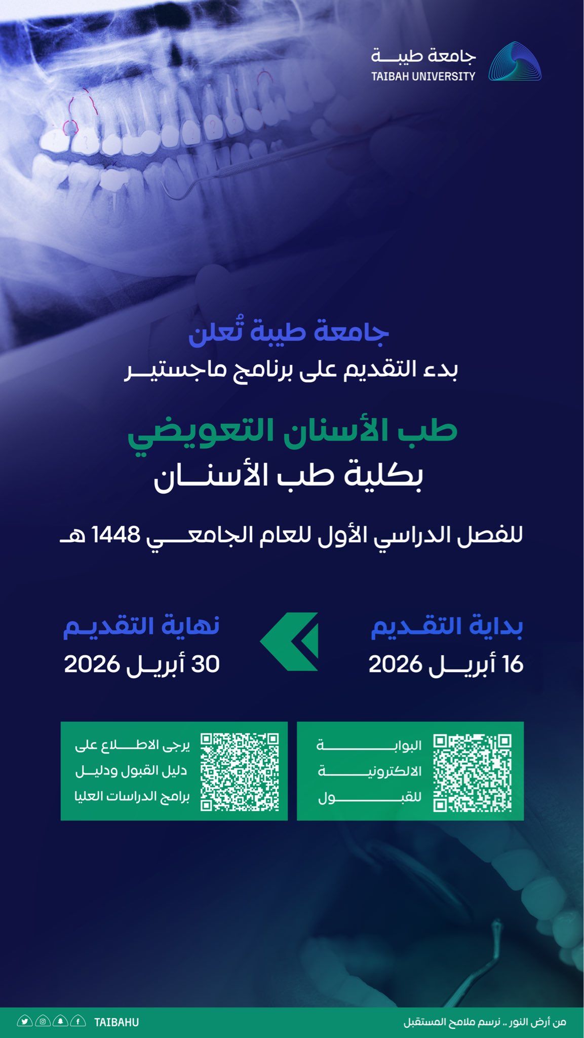 أعلنت جامعة طيبة في المدينة المنورة فتح باب التقديم على برنامج ماجستير طب الأسنان التعويضي بكلية طب الأسنان، وذلك للفصل الدراسي الأول من العام الجامعي 1448هـ.