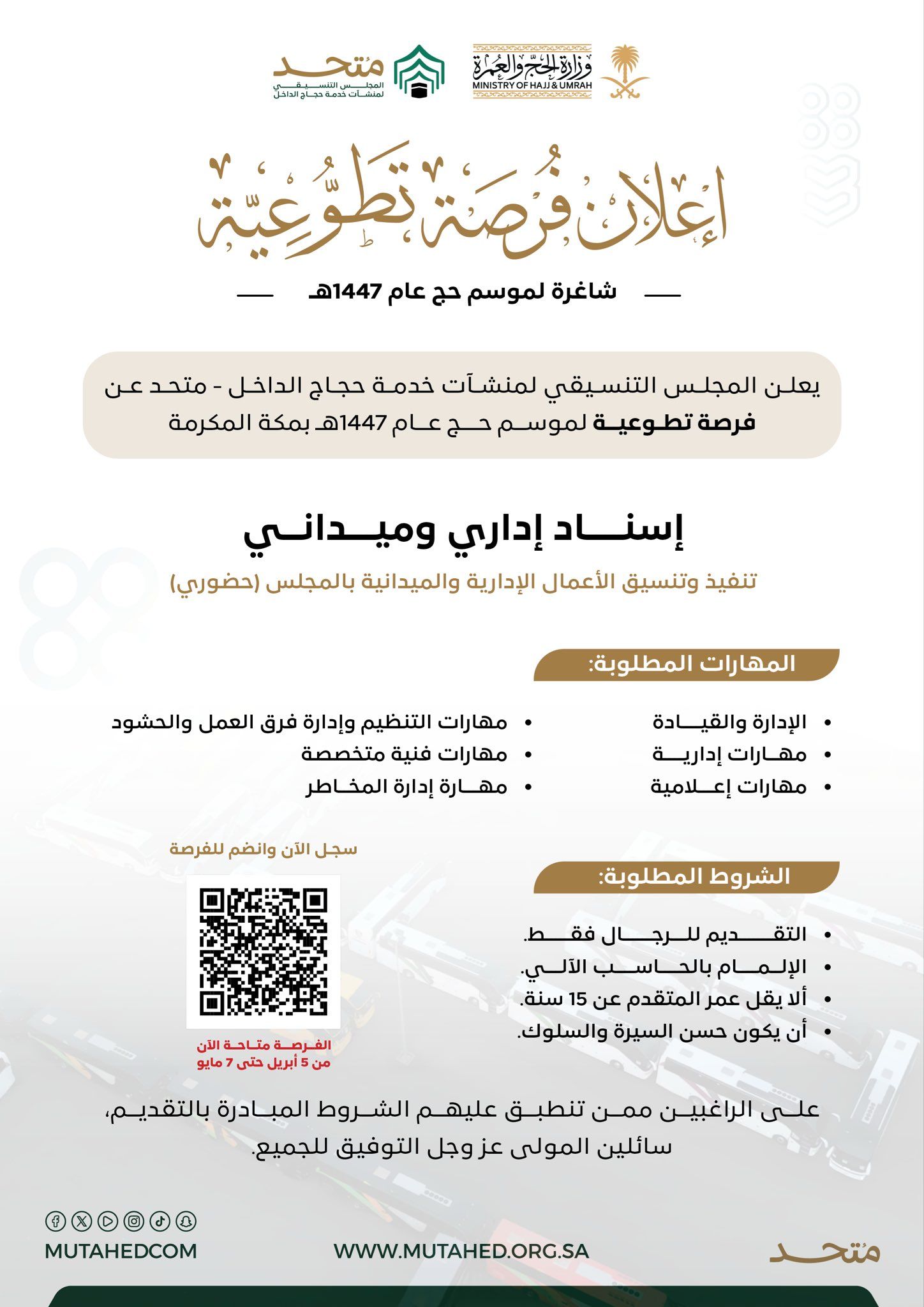 وأشار إلى أن فترة التقديم متاحة حالياً ابتداءً من 5 أبريل وحتى 7 مايو، داعياً الراغبين إلى التسجيل عبر رمز الاستجابة السريعة (QR Code) المرفق في الإعلان، أو من خلال الموقع الإلكتروني الرسمي WWW.MUTAHED.ORG.SA، إضافة إلى حساباته على منصات التواصل الاجتماعي MUTAHEDCOM.