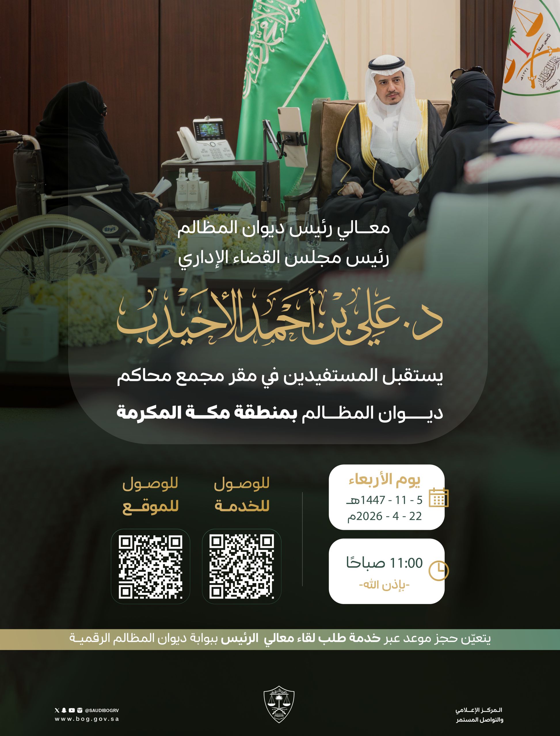 يستقبل معالي رئيس ديوان المظالم رئيس مجلس القضاء الإداري د. علي بن أحمد الأحيدب، المستفيدين في مقر مجمع محاكم ديوان المظالم بمنطقة مكة المكرمة، وذلك يوم الأربعاء الموافق 5-11-1447هـ، الموافق 22-4-2026م، عند الساعة 11:00 صباحًا -بإذن الله-.