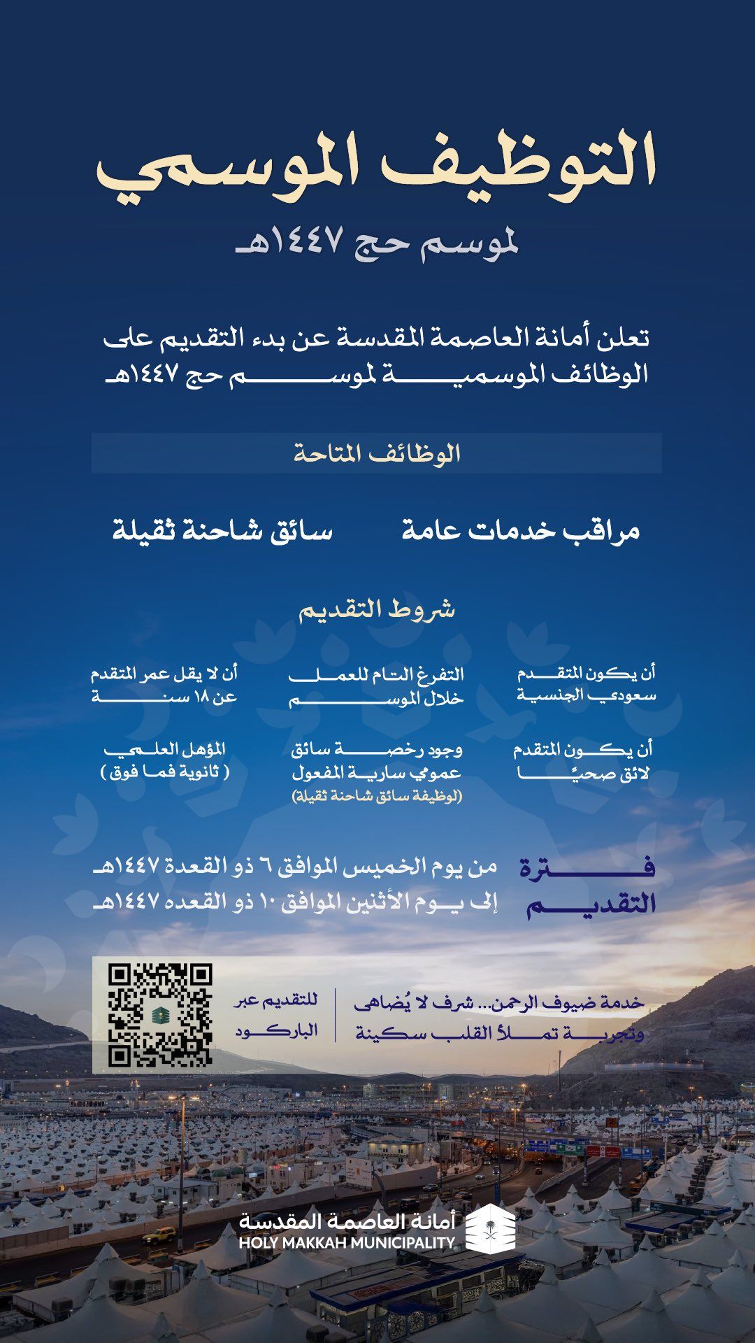 وتستهدف الوظائف الموسمية تعزيز جاهزية الأعمال الميدانية خلال فترة الحج، بما يسهم في رفع كفاءة الخدمات المقدمة في العاصمة المقدسة.