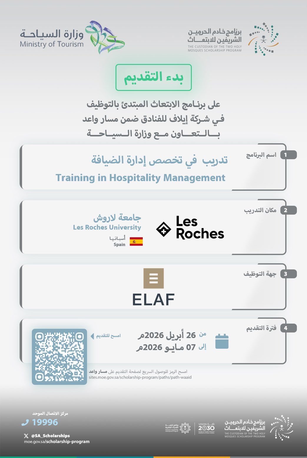 أعلن برنامج خادم الحرمين الشريفين للابتعاث فتح باب التقديم على برنامج الابتعاث المبتدئ بالتوظيف، المقدم من شركة إيلاف للفنادق، وذلك ضمن مسار “واعد”، أحد مسارات برنامج الابتعاث الخارجي، بالتعاون مع وزارة السياحة.