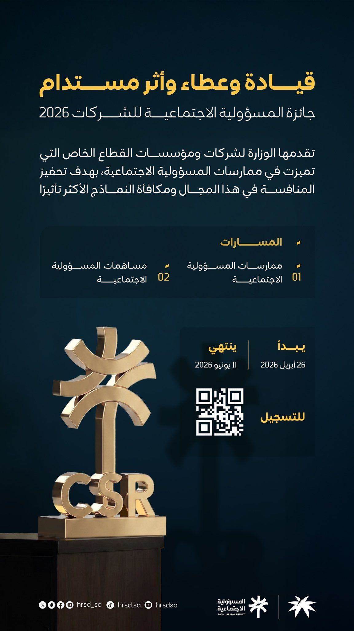 وأكدت الوزارة أن جائزة المسؤولية الاجتماعية للشركات تُعد أحد الممكنات الوطنية لتعزيز دور القطاع الخاص في تحقيق أثر تنموي مستدام، عبر تبنّي ممارسات مسؤولة وفق معايير واضحة وموثوقة، بما يسهم في تحسين جودة المبادرات المجتمعية وتوجيهها نحو أولويات التنمية الوطنية، دعماً لمستهدفات رؤية السعودية 2030.