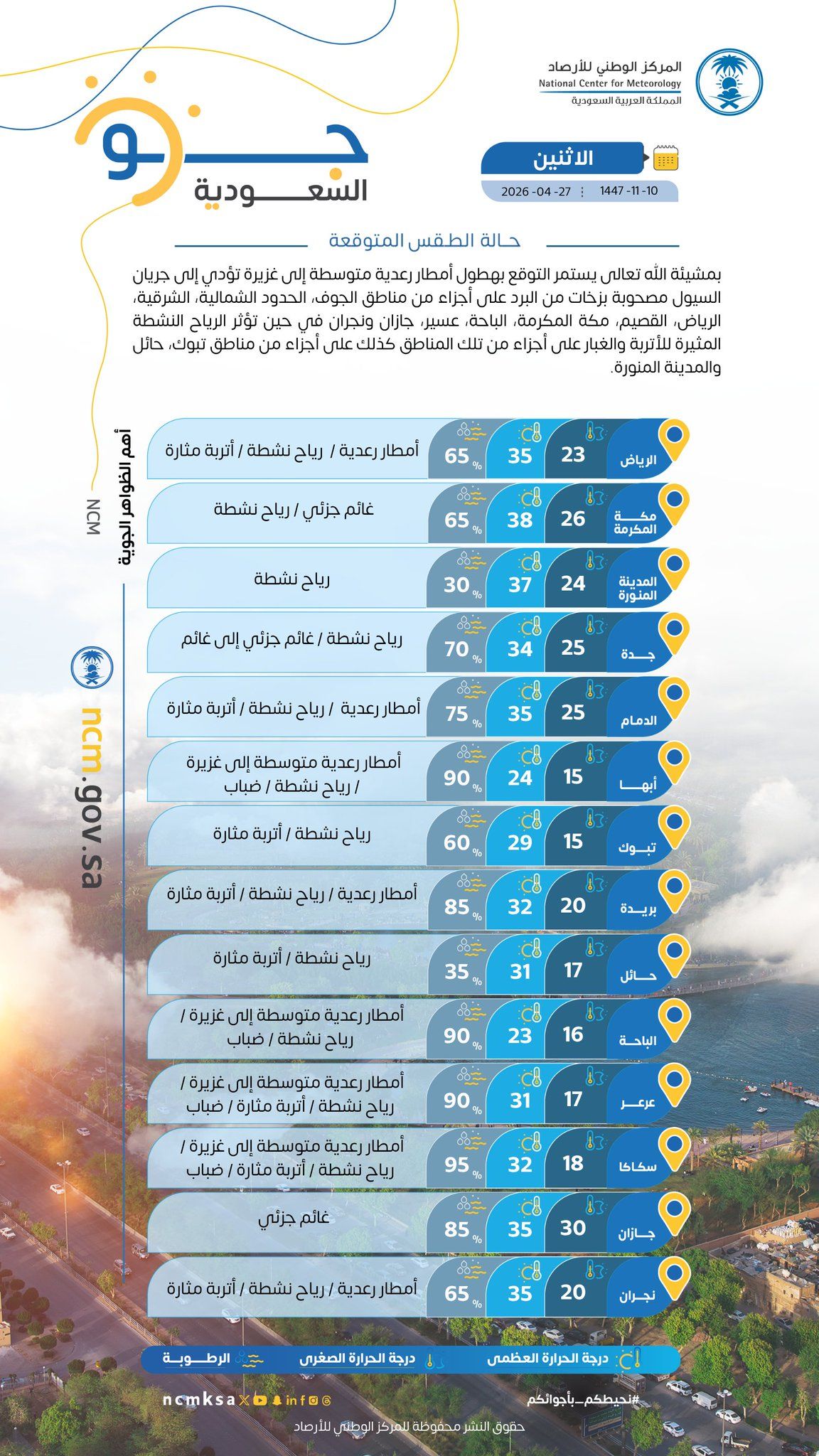توقّع المركز الوطني للأرصاد، في تقريره عن حالة الطقس لهذا اليوم بمشيئة الله تعالى، استمرار هطول أمطار رعدية تتراوح بين المتوسطة والغزيرة، تؤدي إلى جريان السيول، مصحوبة بزخات من البرد على أجزاء من مناطق الجوف، الحدود الشمالية، الشرقية، الرياض، القصيم، مكة المكرمة، الباحة، عسير، جازان ونجران.