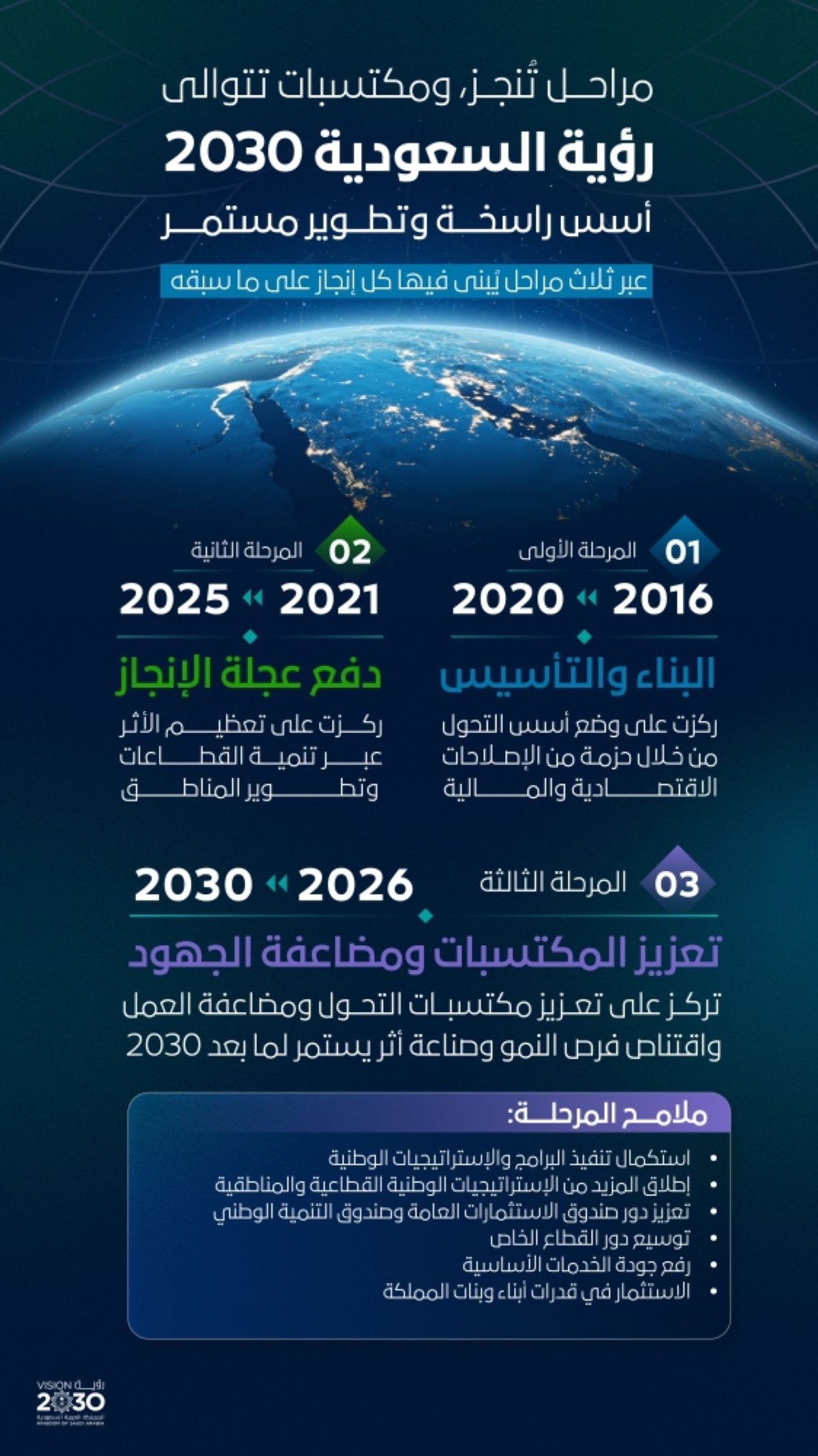 وذكر المجلس بأنه خلال الأعوام ما بين 2021م وحتى نهاية 2025م، كانت الرؤية تمر بمرحلتها الثانية، والتي تركزت فيها الجهود على دفع عجلة الإنجاز، عبر إجراء المزيد من الإصلاحات، وتوسيع زخم التحول بالاعتماد على ما أنجزته في مرحلتها السابقة، فشهدت في هذه السنوات ارتفاعا في جودة الخدمات الحكومية المقدمة، وتسارعا في التنفيذ الفعال للخطط والمبادرات الوطنية، واتساعا في دور القطاع الخاص، وتمكينا للمواطنين وتنامي القدرات والمواهب البشرية المتخصصة، جنبا إلى جنب مع تزايد المشروعات الحكومية ومشروعات صندوق الاستثمارات العامة، لاستثمار فرص النمو التي أخذت تتوالد في القطاعات المختلفة، وتزامن مع هذه المرحلة استحداث الاستراتيجيات التنموية الوطنية لتدفع بالنمو المستدام، والتوسع في الإنفاق الرأسمالي الحكومي على عدد من القطاعات؛ بهدف تحقيق العوائد الاقتصادية والاجتماعية القصوى منها.